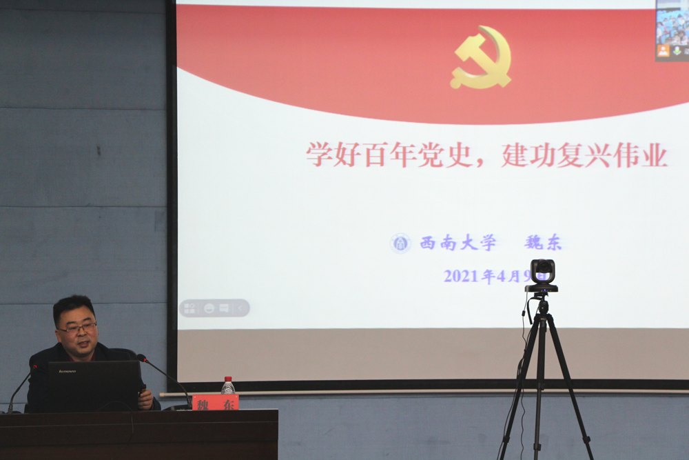 荣昌校区基础部主任魏东为全体党员作了党史学习教育专题辅导:“学好百年党史 建功复兴伟业”。讲座紧紧围绕主题,从“深刻理解新时代深入开展党史学习教育的重要意义”、“准确把握百年党史的基本脉络和基本历史经验”、“正确掌握百年党史学习方法和途径”三个方面进行了详细解读,强调党史学习的关键是抓住“点”、“用”、“法”,要把党史学习教育与当前的工作结合起来,与攻坚克难解决新情况结合起来,以高质量的学习教育成效推动事业高质量发展。