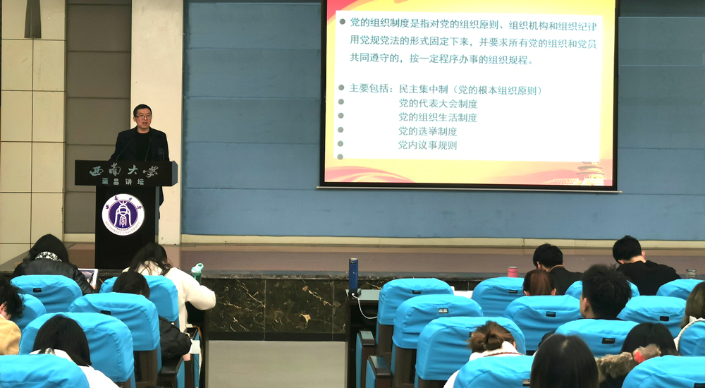 11月26日,学院2021年秋季入党积极分子培训班进行第四次理论课学习。学院党委委员、副院长周克勇为北碚校区学员讲授了《端正入党动机,争做一名合格党员》,学院党委委员、副院长赵中权为荣昌校区学员讲授了《中国共产党的组织制度和纪律》。