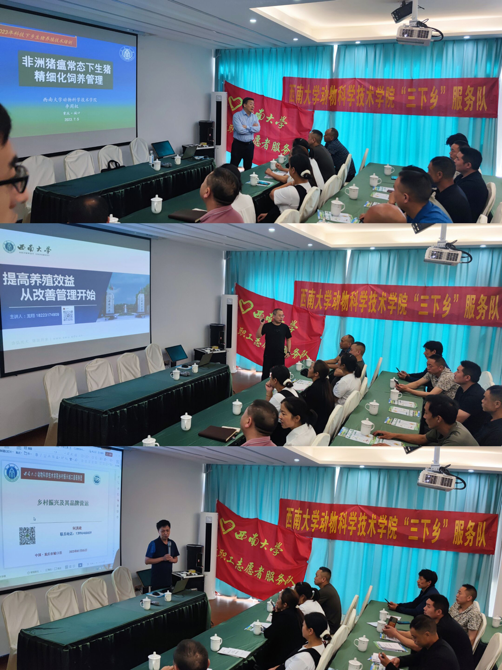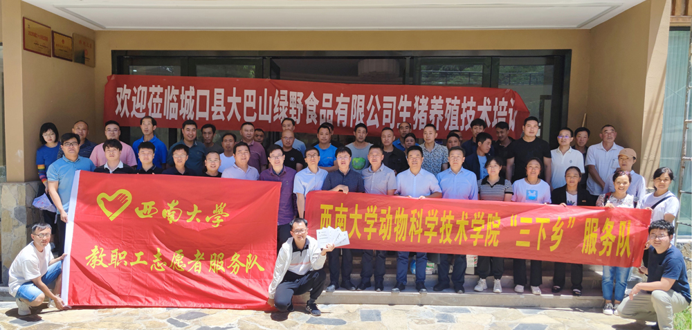 服务队首先来到城口县河鱼乡畜牧村,以专题授课的形式为广大养殖户做了“非洲猪瘟常态下生猪精细化饲养管理”“提高养殖效益从改善管理开始”“乡村振兴及其品牌营运”等培训,通过现场答疑解惑的方式对困扰当地养殖户的技术难题给出建议并进行实时解决,并现场与养殖户建立了线上联系机制,以便养殖户遇到困难时能够及时请教学院专家。同时为养殖户现场免费发放了200余份猪、肉牛、山羊和家禽养殖生产饲养管理技术资料和10000余元由重庆大农科技集团有限公司、重庆西农大科信动物药业有限公司、重庆市天龙牧业科技有限公司、成都牧科八维生物技术有限公司、重庆新动生物技术有限公司、重庆方迅科技有限公司和荆门龙谷饲料有限公司等企业赞助的乳猪用奶粉30份、畜用驱虫药1件(30袋)、兽药2件(80份)、牛羊舔砖3件(12*5 kg)、猪用预混料1件(20袋)、畜禽养殖场消毒剂50套、牛用饲料1吨,并为他们详细讲解了这些畜禽养殖用品及常用药品的使用方法。各养殖户纷纷表示通过此次活动,深深体会到上级部门对农村养殖业的关心和厚爱,也深刻感受到动漫