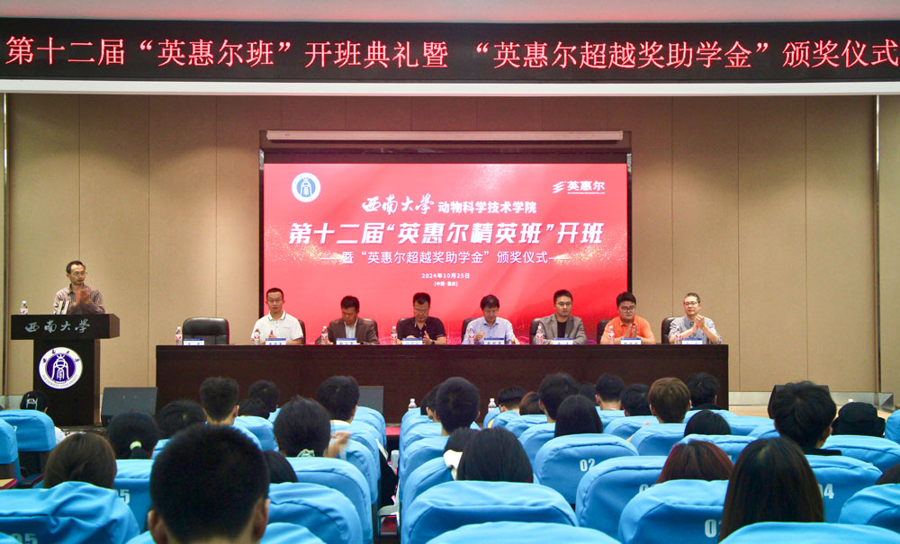 仪式上,赵智华在致辞中表示,希望同学们借助校企合作的良好平台,努力提升适应市场、行业、社会需求的软实力、真本事,成长为高素质的复合人才。赵永聚宣读第十二届“英惠尔班”成员名单。第十二届“英惠尔班”学员代表栗勇涵发言,感谢英惠尔集团对学生们发展的支持和鼓励。许湲宣读2024年英惠尔超越奖助学金获奖名单后,主席台就座的领导嘉宾为获奖学生颁奖。任泽林最后讲话,希望更多同学加入校企合作班,努力学习锻炼,为我国畜牧产业发展做出青春贡献。