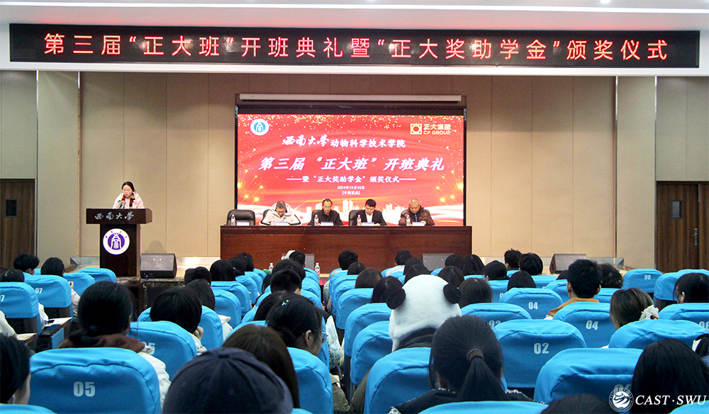 为持续推进校企合作、探索人才培养模式改革,12月16日,学院在荣昌校区2211报告厅举行第三届“正大班”开班典礼暨“正大奖助学金”颁奖仪式。正大集团重庆生猪养殖事业人力资源部经理龚运海,人事专员、第三届“正大班”企业班主任李波,学院党委副书记、纪委书记文武,副院长向钊,学院办公室人员、第三届“正大班”学员和各年级学生代表参加。典礼由第三届“正大班”校内班主任朱恒宇主持。