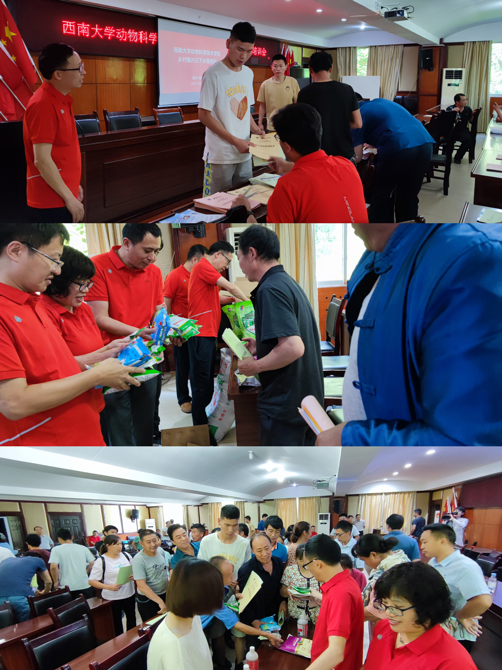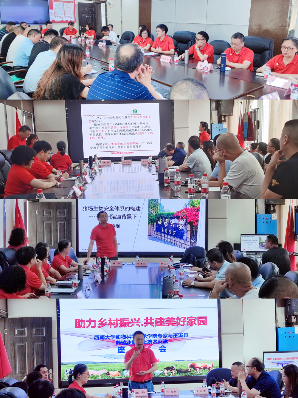 照方案的安排,7月11日—15日,学院党委书记赵智华带领由党员专家团队等组成的15名教职工暑期志愿者“三下乡”服务队先后赴重庆市巫溪县和城口县修齐镇、咸宜镇李坪村开展“三下乡”活动。活动期间,服务队先后到巫溪县陆旺养殖有限公司和重庆腾展家禽有限公司进行实地走访,了解企业生产经营中遇到的困难和问题并进行现场指导,并先后听取了重庆市巫溪县农业农村委和城口县修齐镇、咸宜镇李坪村相关领导、养殖企业(户)的科技需求及乡村振兴中遇到的问题困难。针对大家提出的问题,服务队老师们以专题授课的形式做了养殖技术、营养与饲料、疾病防控等方面的培训,并通过现场答疑解惑的方式解决了许多困扰当地养殖企业的技术难题,与养殖企业(户)建立了线上联系机制,以便他们遇到困难时能够及时得到帮助。服务队还为养殖企业(户)现场免费发放了200余份《助力乡村振兴科技下乡养殖技术资料》和3000余元由重庆大农科技集团有限公司、重庆西农大科信动物药业有限公司、同连生物科技集团和重庆新动生物技术有限公司等企业赞助的乳猪用奶宝60份、乳猪抗痢产品40份、牛羊肥40份、益生菌添加剂100包,并为他们详细讲解了这些畜禽养殖用品及常用药品的使用方法。