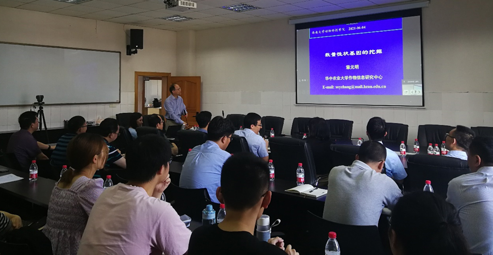 2021年6月4日下午,学院邀请华中农业大学章元明教授作题为“数量性状基因的挖掘”学术报告。会议由赵中权副院长主持,学院相关教师和研究生在2教404(荣昌)和37教223(北碚)参加。