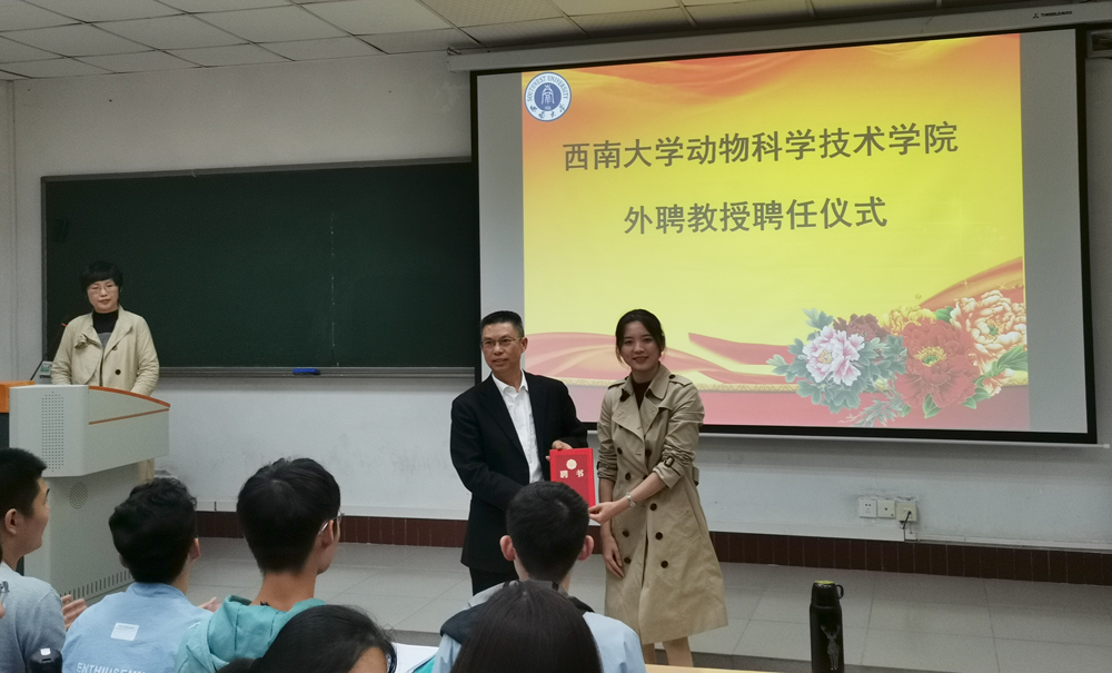 为提高教育教学质量,培养优秀的动物科学人才,2020年10月26日,学院为正大集团农牧食品企业中国区副董事长唐贻林先生举行外聘教授聘任仪式。聘任仪式由学院动物营养与饲料科学系杨游主任主持,人才培养工作办公室刘一丹主任向唐贻林先生颁发了聘书。