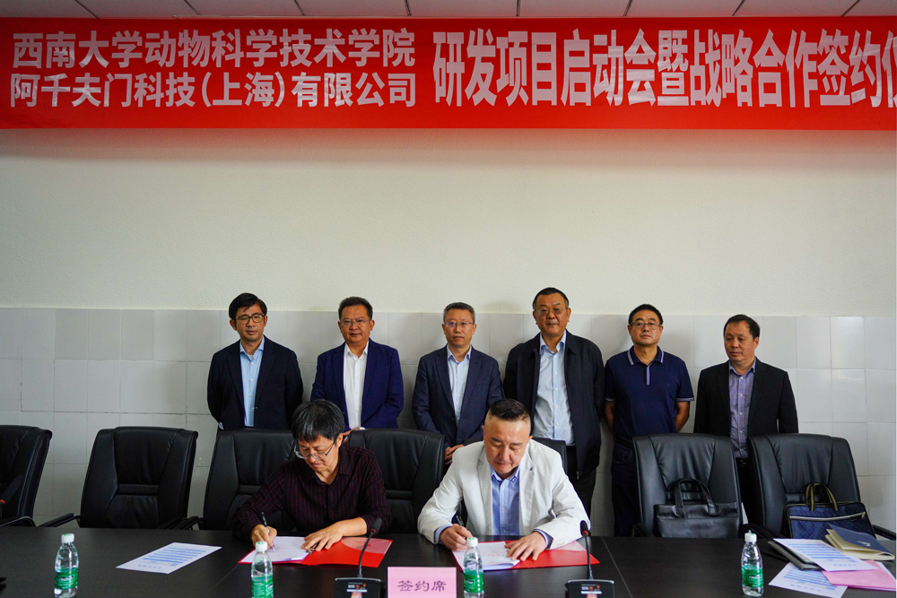 10月20日,学院与阿千夫门科技(上海)有限公司(以下简称“阿千科技”)战略合作签约仪式在荣昌校区第二教学楼举行。荣昌区副区长程昌耀、重庆市畜牧科学院院长刘作华、重庆市农业农村委员会总畜牧兽医师汤明、对外合作处处长王涯军、畜牧处一级调研员许会军、荣昌区科技局局长赵敏、荣昌区农业农村委副主任张义君、招商办主任陈光虎、畜牧中心主任林丹、阿千科技董事长胡中一、董事廖勇、施戎、吴任斌等参加仪式,仪式由赵中权副院长主持。