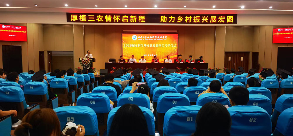 毕业生代表康佳分享了自己在时代洪流中与学院同成长的经历,号召同学们用在大学期间塑造的优良品格、锻炼出的过硬本领、收获到的宝贵学识,踏上新的人生旅程,用实际行动书写属于西大、属于“六有”新动科人的华彩篇章。