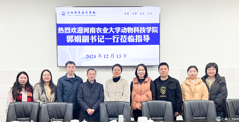 12月13日,河南农业大学动物科技学院党委副书记郭娟、团委书记兼组织员韩笑、辅导员杨超然来学院调研交流,学院党委副书记、纪委书记文武,团委书记、学生工作办公室主任孙海军,组织员贺春湘,辅导员彭香、朱恒宇和青年教师徐乃一等陪同调研。